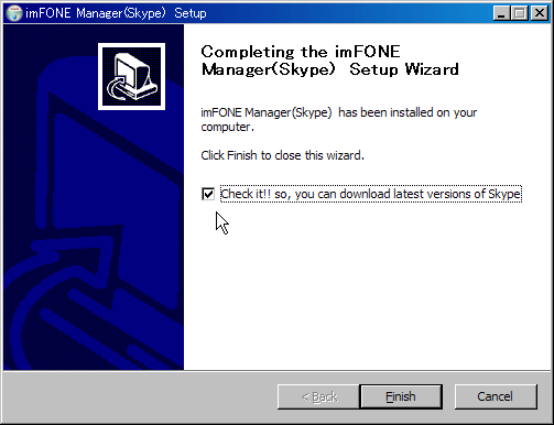 英語版ですが特に難しい設定は無いのでそのままインストール。最後の「YOUのPCにスカイプは入ってるのん?入ってないなら新しいのDLしちゃいなYO!」っていうチェックがあったので(デフォルトでチェックON状態)スカイプをまだインストールして無いからとりあえずチェックしたままFINISH。
