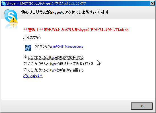 imFONEとSkype連携のアラートなので許可。