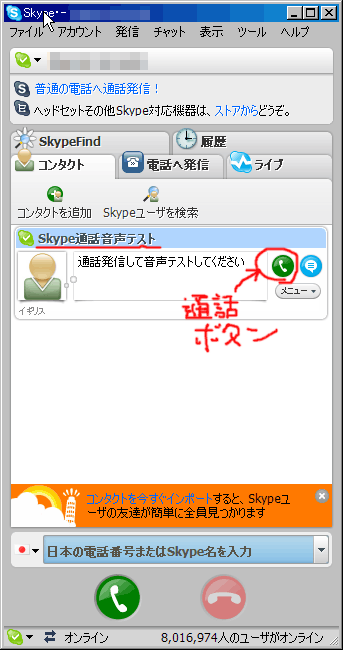 いやね、最初一人でどうやってテストしよう?って悩んでたんですがケドね心配無用でございました。「Skype通話音声テスト」というのが最初から登録されているので選択して発信!(受話器マーククリック!)