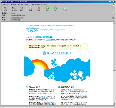 普通、このメールだとSkype知らなかったりしたらまずメール開けないだろうし、Skype知っててもなんか怪しくてメール開けるの躊躇してしまいそうな気がする(ワタシだと絶対に開けないデス)