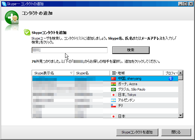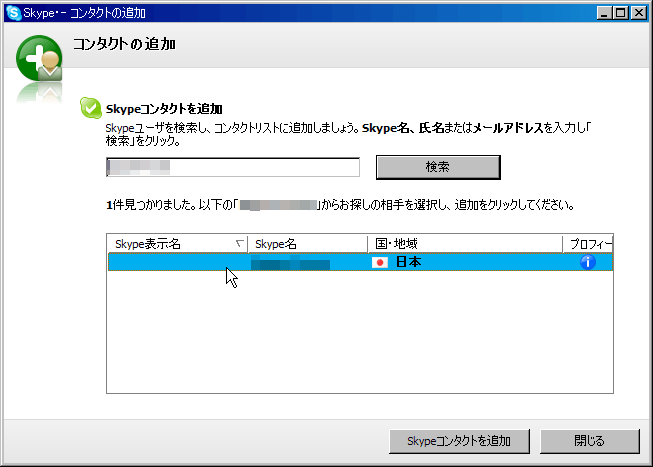目的の相手がリストアップされたので[Skypeコンタクトを追加]